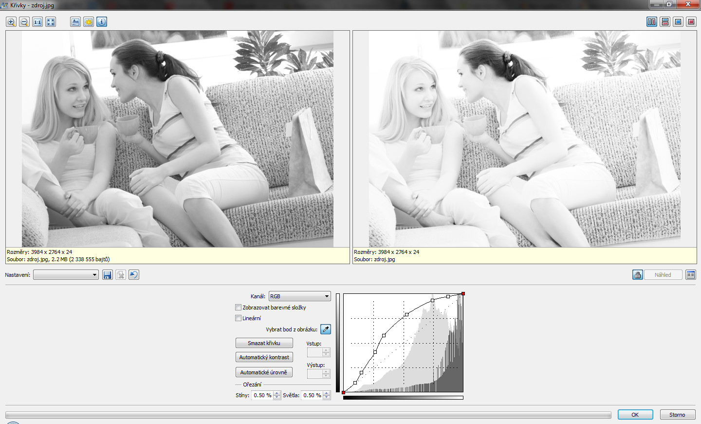 Jakmile máte snímek černobílý, přichází na řadu práce s křivkami, které umožňují jednotlivé tóny obrazu zesvětlovat či naopak ztmavovat. Upravená křivka by měla mít podobný tvar, jako na obrázku – vybrané body přetáhněte směrem nahoru a křivku mírně zvlňte. Máte-li raději kontrastnější snímky, pak můžete velmi opatrně pracovat i s tmavšími tóny.